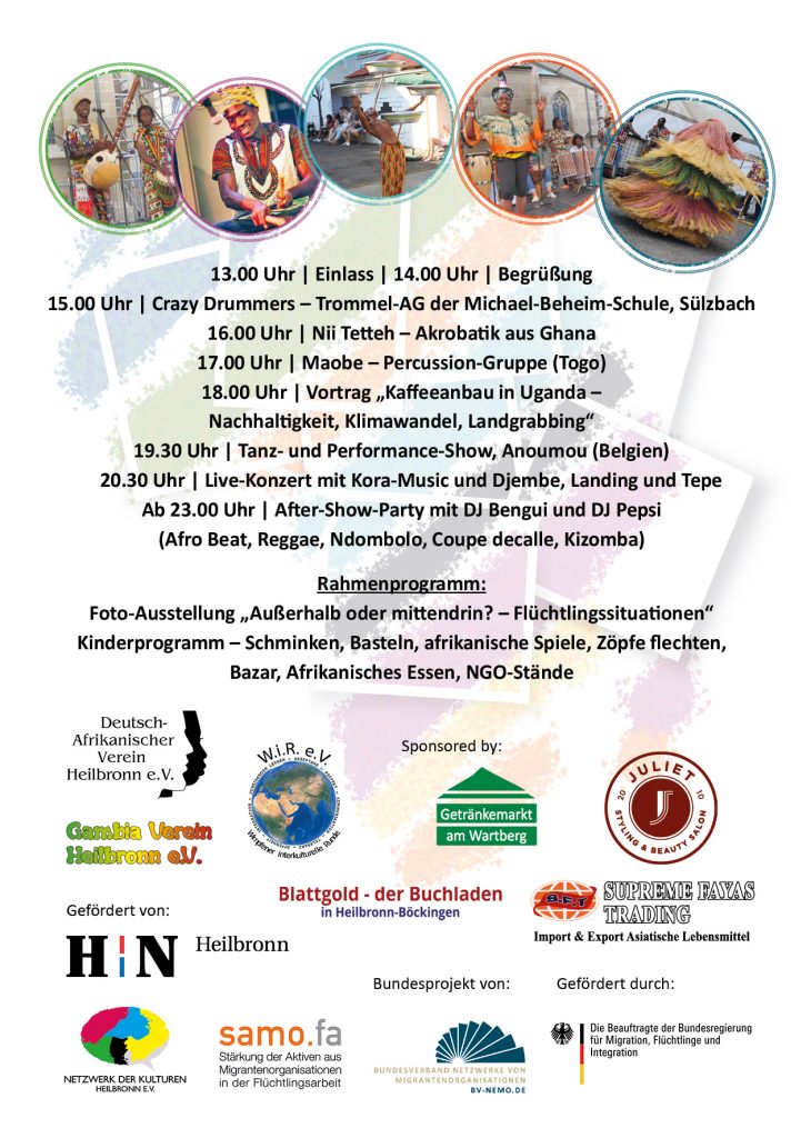 In Zusammenarbeit mit anderen afrikanischen Vereinen wird ein bunt gemischtes Programm für alle Sinne angeboten. Dazu gehören Trommeln und eine Fotoausstellung. Für die kleinen Besucher gibt es ein Kinderprogramm. Am Abend wird die Erzählwerkstadt von Diaphania und keb mit zwei Migrantengeschichten vertreten sein. Ein Marimba-Konzert wird das Publikum verzaubern. Kulinarisch wird das Fest mit afrikanischen Spezialitäten abgerundet.